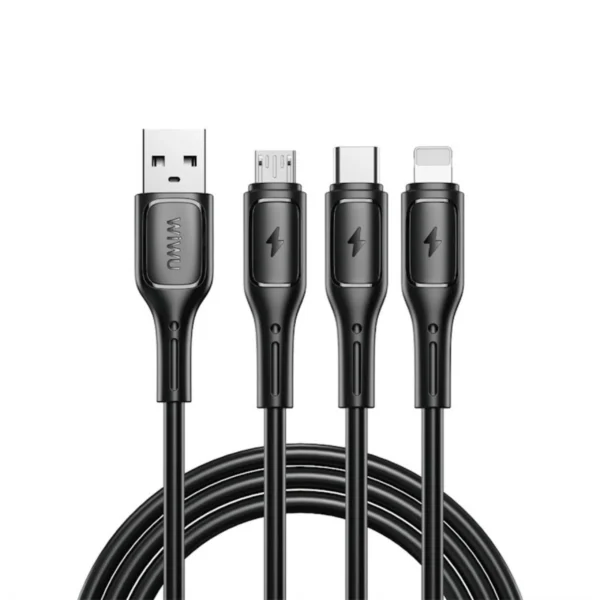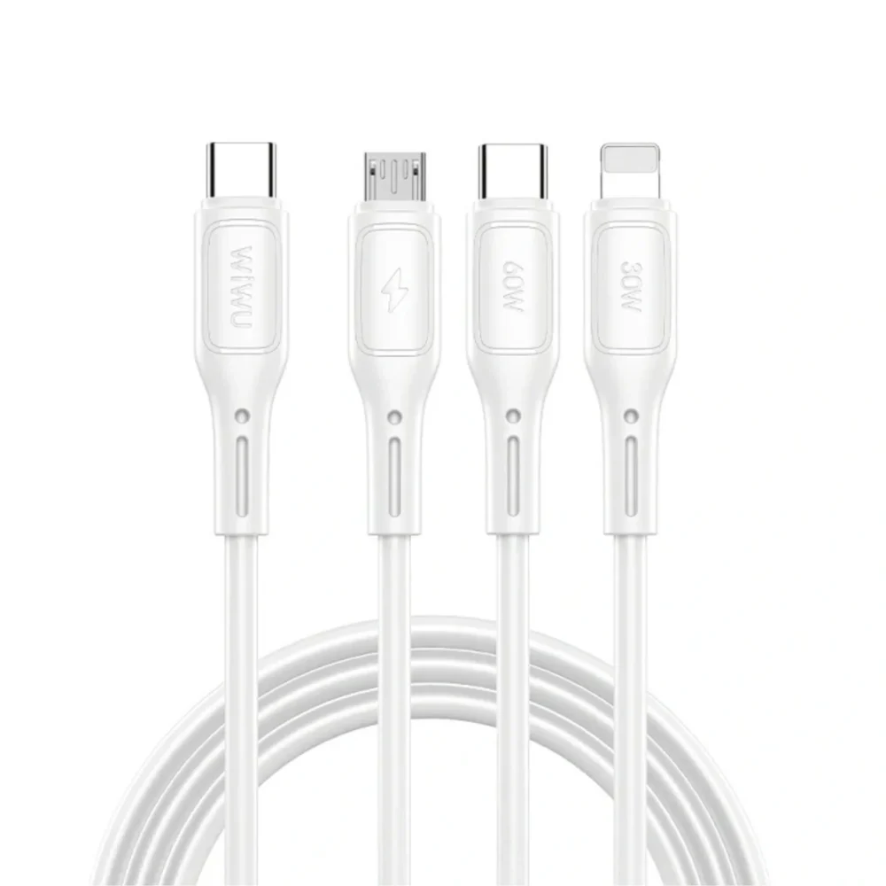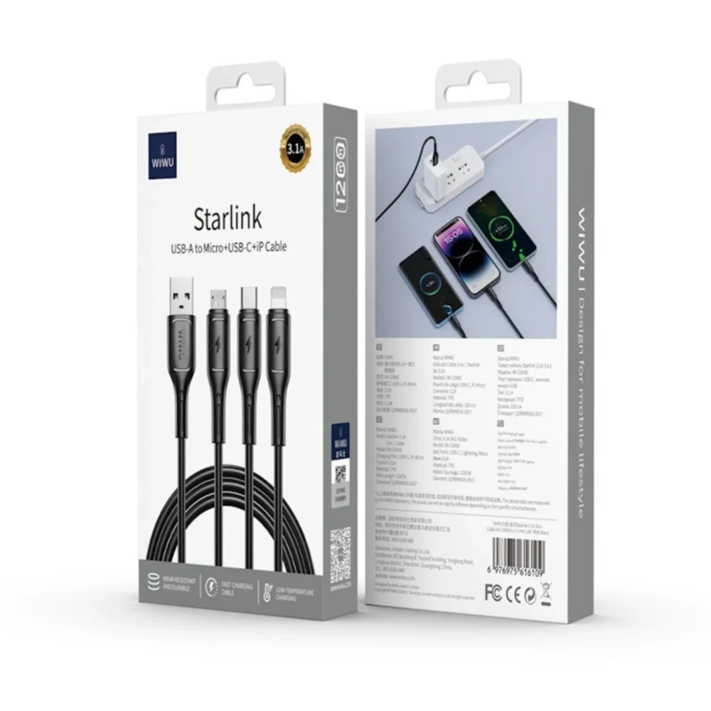 The WiWU Starlink Wi-C046E 3-in-1 Cable is the perfect all-in-one charging solution, featuring USB-C, Micro USB, and Lightning connectors for universal compatibility. With 3.1A fast charging and a durable, tangle-free 1.2m cable, it’s ideal for Apple and Android devices alike.